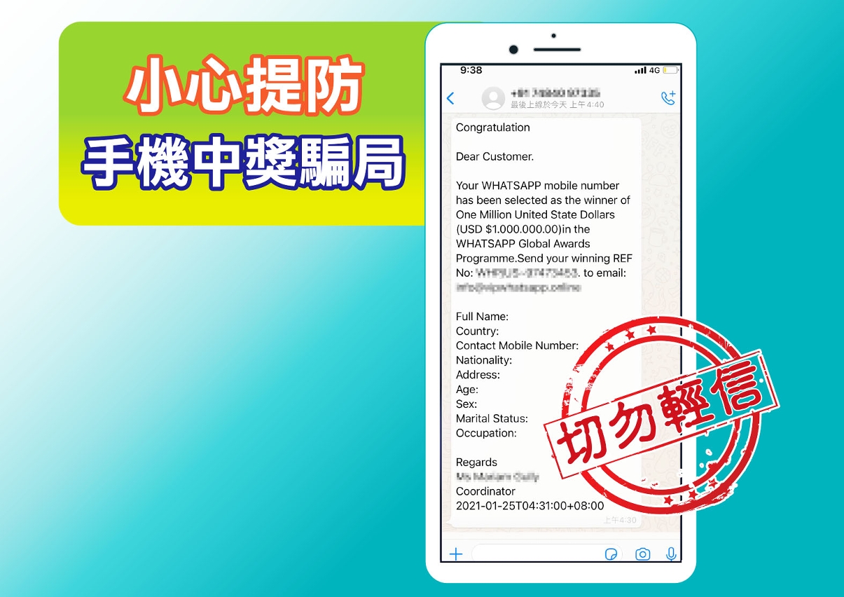 今日,司法警察局接获“司警局妇女防罪之友”会员举报,指其手机WhatsApp帐号收到一条来历不明的英语信息,内容称其WhatsApp手机号码在WhatsApp全球奖励计划中被选为100万美元的获奖者,并要求该会员将获奖编号连同姓名、国籍、联络电话、年龄、性别及住址等个人资料电邮至指定电子邮箱,以领取奖金。由于近日司警局曾发出警情通告提醒市民防范手机通讯软件诈骗,故其有所警惕,没有上当,并马上向司警局作出举报。