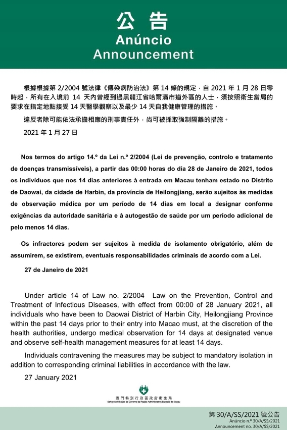新型冠状病毒感染应变协调中心宣布,因应黑龙江省的最新疫情发展,卫生局根据第2/2004号法律《传染病防治法》第14条的规定,自2021年1月28日零时起,所有在入境前14天内曾经到过黑龙江省哈尔滨市道外区的人士,须按照卫生当局的要求在指定地点接受14天医学观察以及最少14天自我健康管理,违反者除可能依法承担相应的刑事责任外,尚可被采取强制隔离的措施。