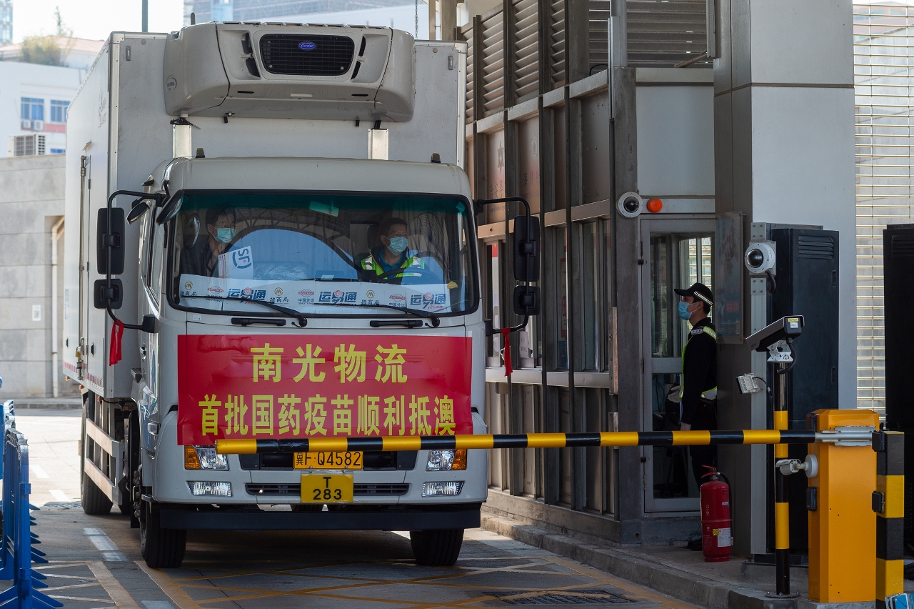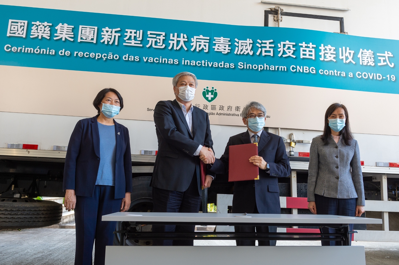 此批疫苗由北京以陆路经过30多小时运抵本澳,运输过程得到了中联办、南光(集团)有限公司及相关部门的全力协助。在卫生局药物事务厅稽查人员完成入口检查手续后,南光集团傅建国董事长移交国药集团新型冠状病毒灭活疫苗,由卫生局李展润局长签署接收疫苗文件。出席仪式的还有中联办宣传文化部万速成部长、殷汝涛副部长;卫生局陈永华副局长、药物事务厅蔡炳祥厅长、疾病预防控制中心林松主任等。