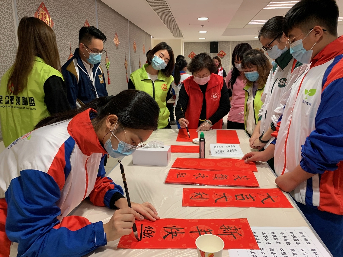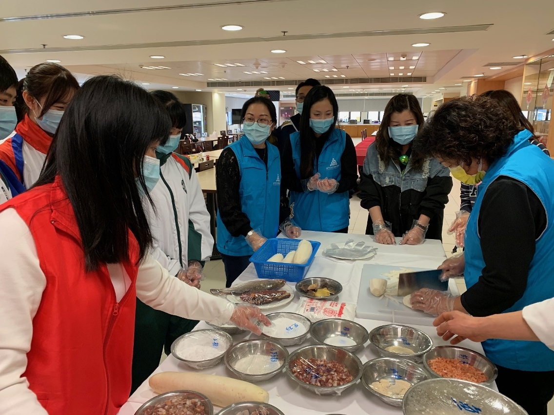 2月6日中午,在司警局总部大楼的员工餐厅内洋溢着欢乐热闹气氛,司警局人员联同二十多位妇女防罪之友会员、社区安全青年领袖及灭罪小先锋学员,在专业师傅的指导下认真、忙碌地制作贺年萝卜糕,并亲手写挥春,准备新春福包。随后,一行人前往路环石排湾公屋群探望该区的独居长者,将贺年萝卜糕和福包赠予长者们,提前向他们送上春节问候和祝福。