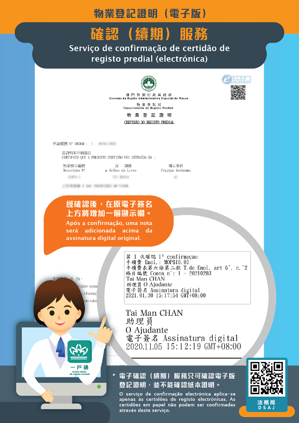 为配合特区政府推行智慧政务,以及贯彻公开物业及商业登记信息,以保障受法律保护交易安全的目的,法务局-物业登记局、商业及动产登记局推出物业登记证明(电子版)及商业登记证明(电子版)的电子确认(续期)服务。