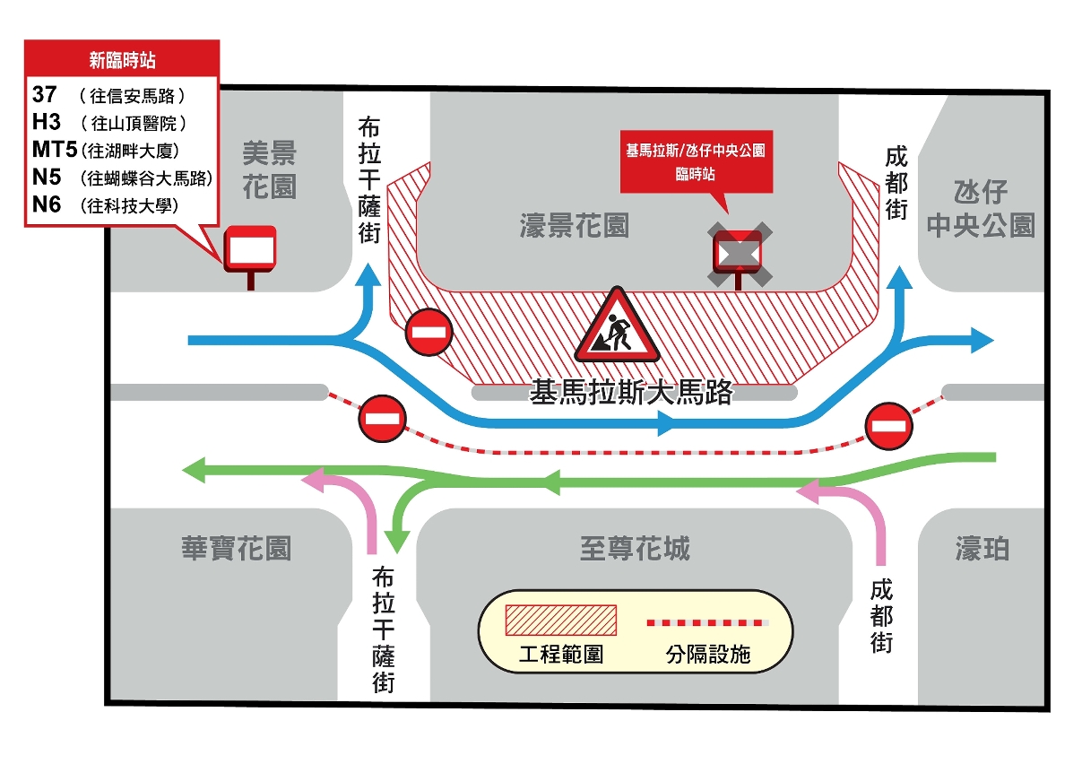 配合即将开展靠近濠景花园的一段基马拉斯大马路重铺工程,由下周三(2月17日)起介乎布拉干萨街与成都街、靠近濠景花园一侧的一段基马拉斯大马路实施封闭交通,近至尊花城一侧的路段实施临时双向行车;另外,现时设于濠景花园的“基马拉斯/氹仔中央公园"临时巴士站会往运动场圆形地方向迁移约100米至美景花园对出。详情请查阅澳门公共汽车股份有限公司网页http://www.tcm.com.mo/web/NewsVB/data/610_cn.PDF及新福利公共汽车有限公司网页 https://www.transmac.com.mo/route-change/20210218/。