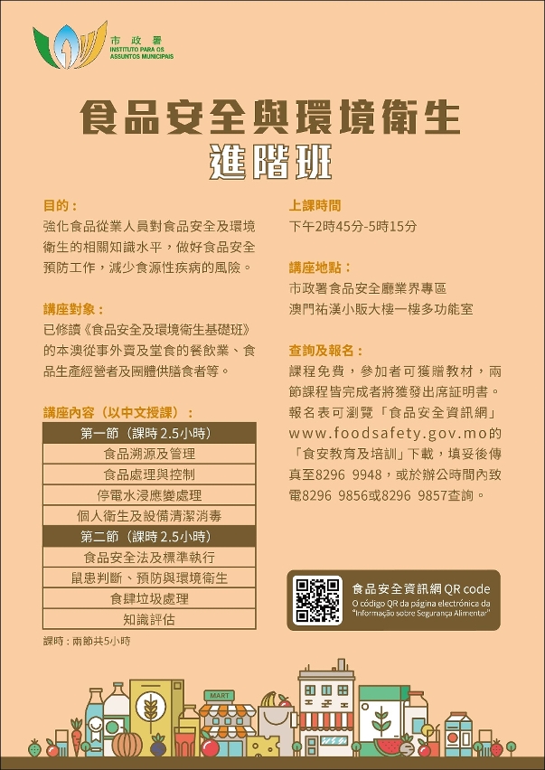 为配合防疫措施,出席学员进场前须测量体温及佩戴口罩,并出示当天有效的澳门健康码。有意报读的人士可登入食品安全信息网页瞭解详情,并下载及填妥报名表格,由即日起至4月1日电邮至dir-info@iam.gov.mo 、传真至8296 9948,或于办公时间递交至佑汉小贩大楼1楼市政署食品安全厅业界专区及市政署各区市民服务中心报名。课程名额有限,额满即止。如有疑问,可于办公时间内致电8296 9856或8296 9857查询。