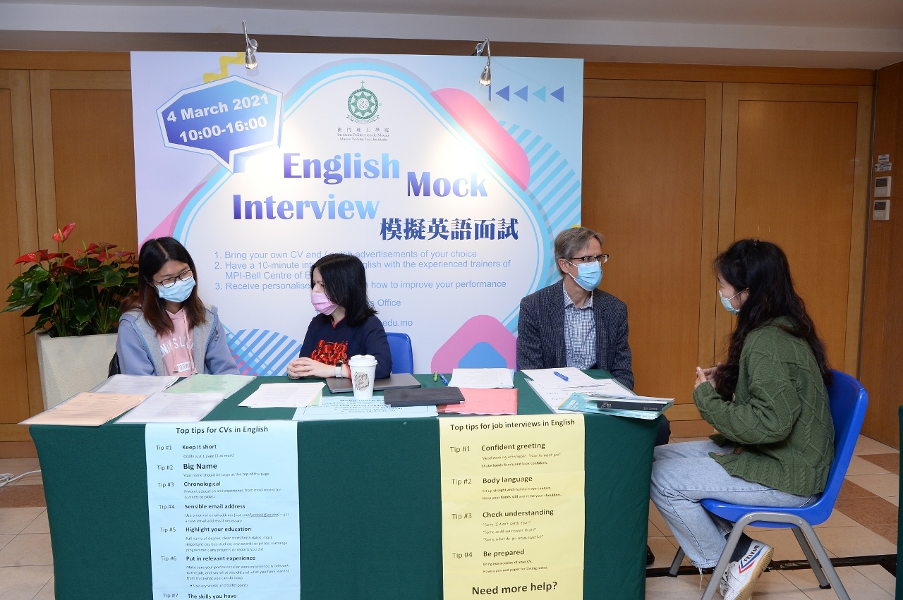 就业讲座邀请劳工事务局、行政公职局、经济及科技发展局、广州市南沙区青年联合会、澳门大湾区人力资源协会及多间机构代表主讲,介绍面试攻略、求职技巧、职场分析、人才需求、澳门青年在大湾区的就业及创业福利政策、创业创新等多个主题。理工-贝尔英语中心导师为学生举办英语履历写作以及英语模拟面试工作坊,为学生求职作充足准备。有出席多个讲座的电脑学专业准毕业生表示,疫情期间信息科技的应用更普及广泛,酒店、银行、博彩等不同行业都提供与专业对口的工作机会,参加讲座是为瞭解不同行业的发展及晋升前景。而出席《南沙实习、就业、创业服务》讲座的中英翻译专业准学生则表示曾参加大学生横琴实习计划,收获很大,故希望瞭解其他大湾区城市的就业及实习机会。