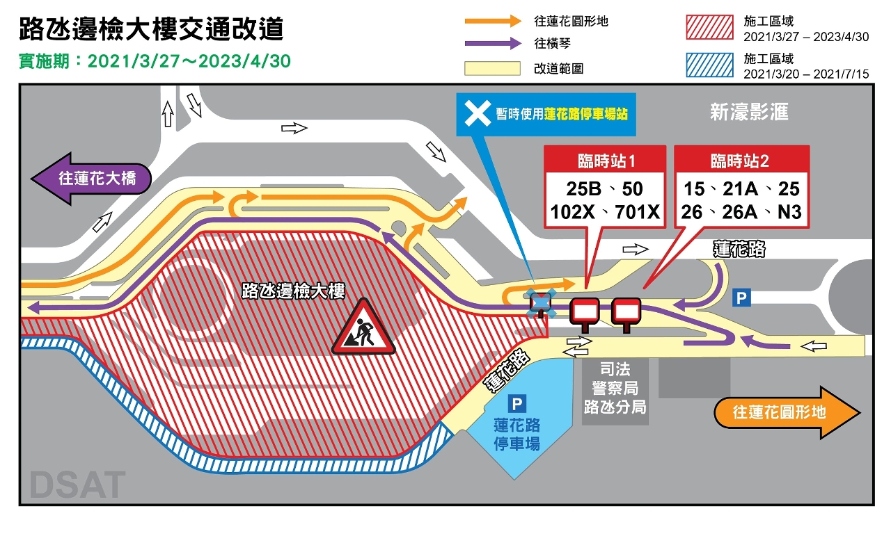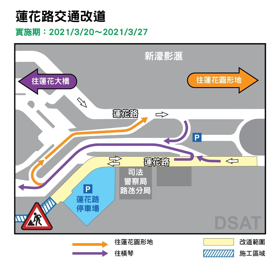 此外,建设发展办公室于3月27日至2023年4月30日亦会开展拆除原路氹边检大楼建筑物并建造新轻轨站之工作,故原路氹边检大楼内部的交通安排,将作出相应调整,其中莲花路停车场与莲花大桥之间的一段莲花路(往莲花大桥方向)实施封闭交通,往轻轨莲花口岸站方向则实施双向行车。