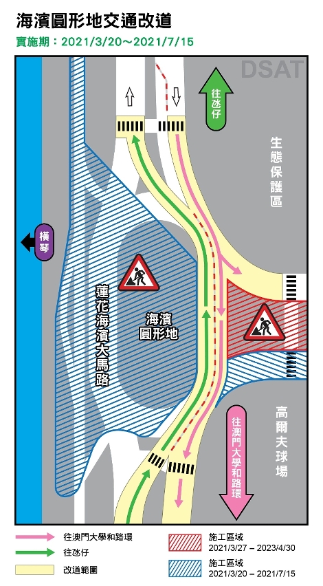 配合建设发展办公室开展澳门轻轨延伸横琴线项目,由2021年3月20日(周六)起,相关道路将分阶段实施临时交通安排,其中靠自行车径一侧的海滨圆形地由3月20日至7月15日封闭交通,靠莲花路一则的海滨圆形地改为双向行车;莲花路停车场与海滨圆形地之间的一段莲花路,即往海滨圆形地方向也实施封闭交通,车辆不能经由莲花路左转入澳大河底隧道,只能经莲花海滨大马路进入。