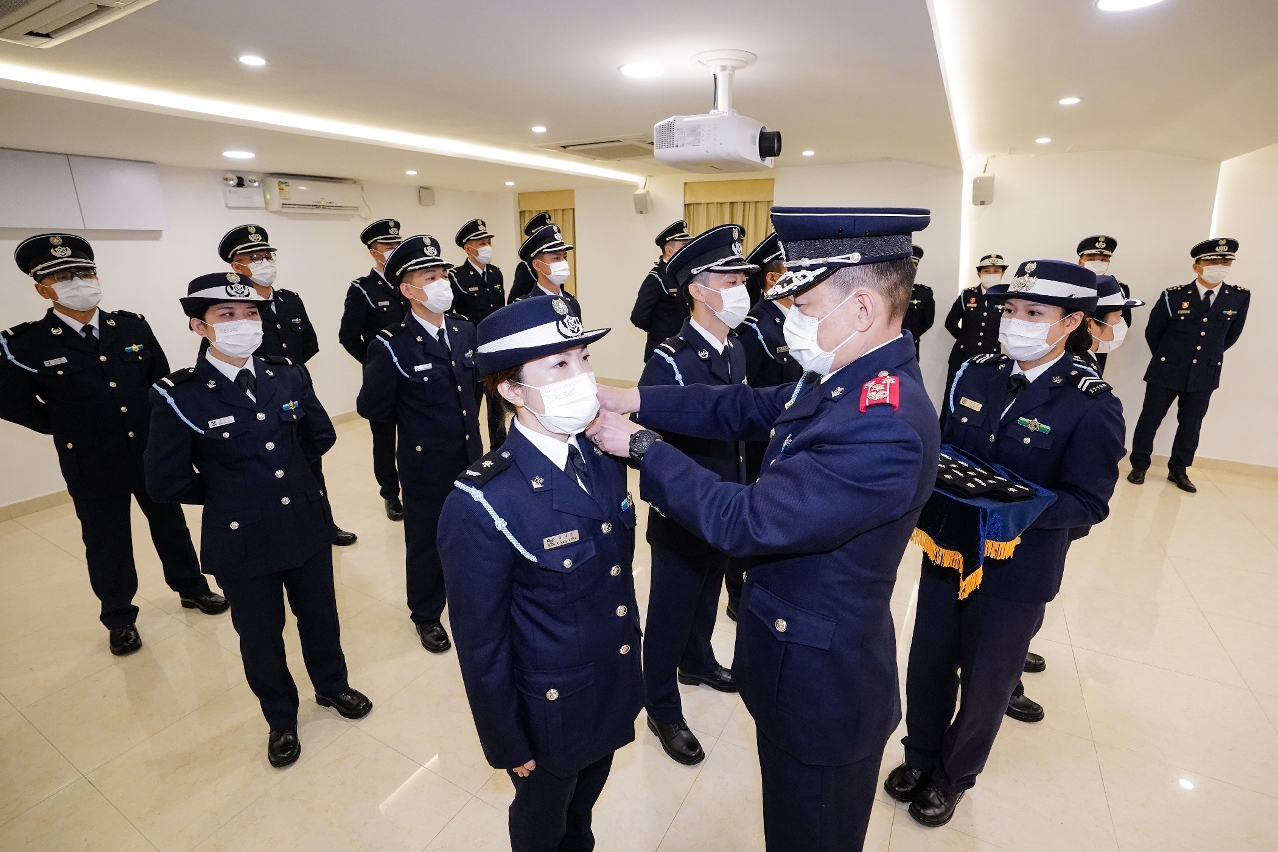 各晋升人员在宣誓后,由黄伟文助理关长为各人戴上新肩章,正式晋升成为关务督察。是次晋升人员均具备专科或学士以上学位,仪式上亦向获得总成绩优异奖的人员徐健颁发奖项。