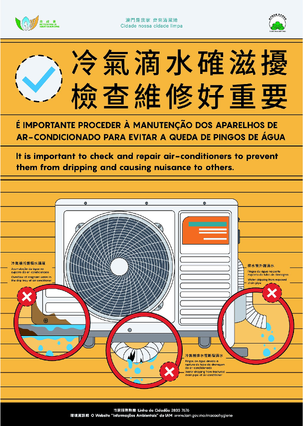 不少市民使用冷气机时,可能会忽略检查冷气机的排水喉管是否已经妥善接驳,从而衍生滴水问题,冷气机水滴落檐篷的声音不但滋扰他人,所造成的积水亦有机会孳生蚊虫,影响公共卫生。市政署呼吁市民在使用气机前,应先检查排水喉管有否妥善接驳或出现断裂、底盘有否满溢或渗漏等情况,如有滴水问题应尽快改善或邀请专业冷气技师进行维修。