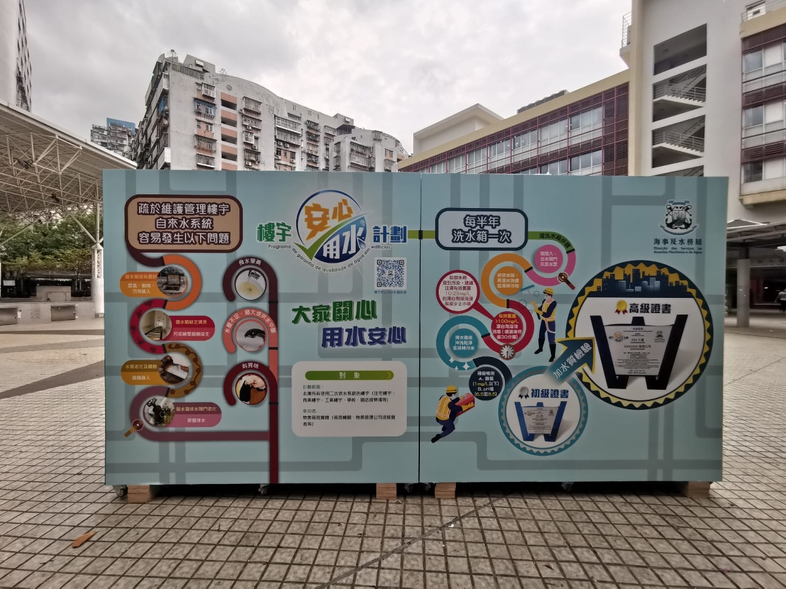 “楼宇安心用水计划”旨在促进大厦业主及物业管理实体加强楼宇自来水系统的维护管理,目前共500栋大厦参加,约占全澳高层楼宇的四成,其中获高级证书的有280栋大厦,获初级证书的有220栋大厦。参与计划的楼宇只要按要求对内部自来水系统进行维护,包括每半年清洗水箱一次等,即可获发初级证书;如在此基础上进行水质检验且合格,更可获发高级证书。计划详情及参与办法可浏览局方网页www.marine.gov.mo。