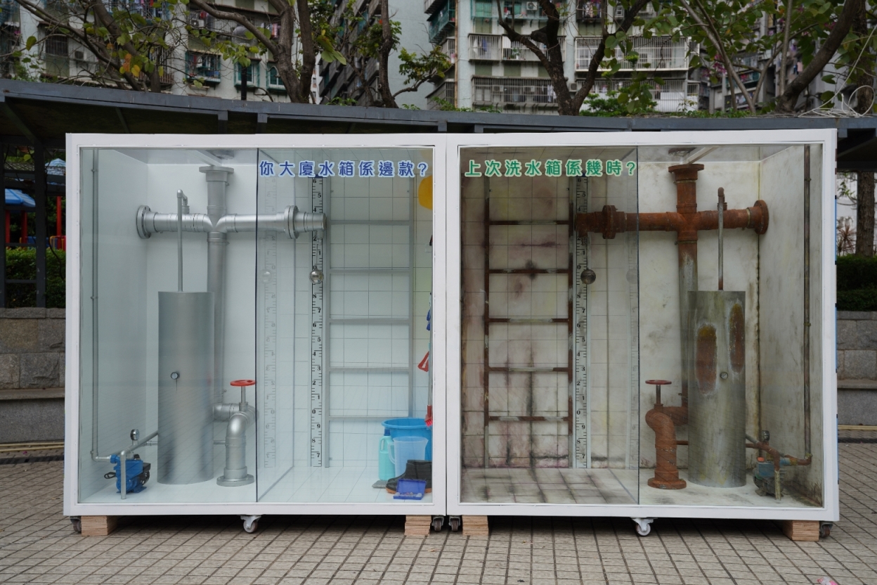 展出的邋遢水箱和洁净水箱各高约两米,左右并列摆放,形成强烈对比。邋遢水箱展示了疏于清洗水箱以及维护自来水系统可能引致的恶劣情况,当中包括污垢积聚、细菌滋生、水管及排水阀门老化等,最终流入家居的食水很可能出现变黄、有异味、水压不稳等二次供水安全问题,影响住户健康。洁净水箱则呈现了妥善维护自来水系统,包括每半年清洗水箱之后的良好状态。另外,水箱内部陈列了清洗水箱的工具,背面则展览有关疏于维护楼宇自来水系统容易发生的问题、洗清水箱步骤以及“楼宇安心用水计划”的详细资料。