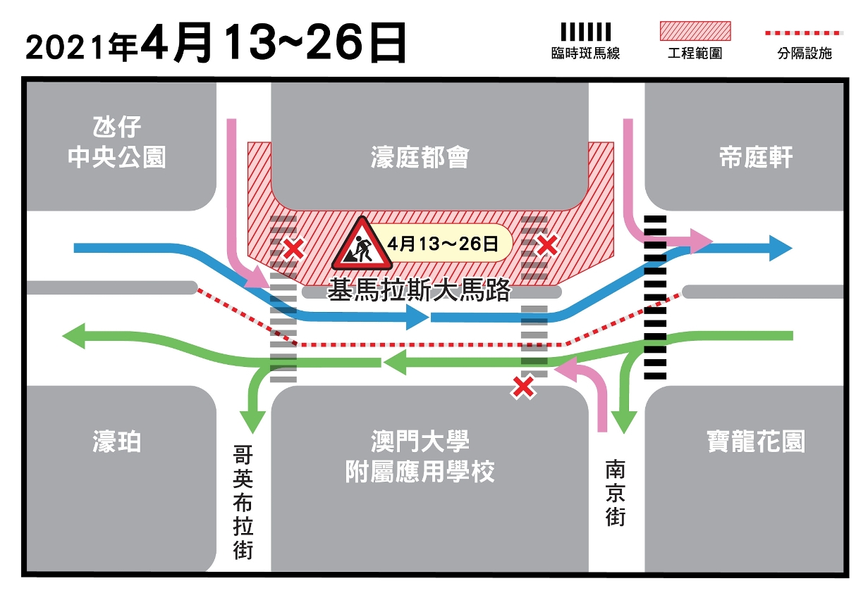 配合空中走廊工程,土地工务运输局将重铺氹仔哥英布拉街与南京街之间的基马拉斯大马路。4月13日至26日近濠庭都会一侧的路段实施封闭交通,近澳门大学附属应用学校一侧的路段则实施临时双向行车;此外,哥英布拉街近濠庭都会的路段实施有限度通车;南京街近濠庭都会的路段则改为单一方向行车,车辆只能往基马拉斯大马路方向行驶。