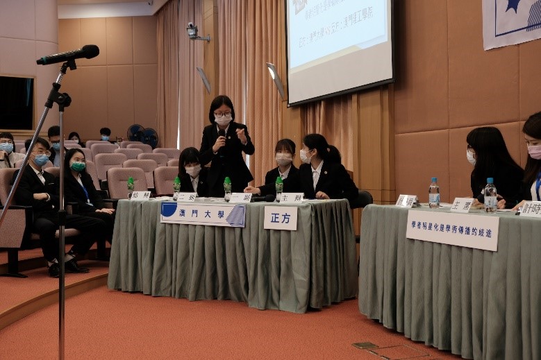 比赛辩题为“学者明星化是学术传播的歧途”,正方澳大派出法学院二年级、郑裕彤书院黎彩琼为主辩;教育学院一年级、吕志和书院苏晓怡为第一副辩;法学院一年级、满珍纪念书院洪森迎为第二副辩以及法学院二年级、张昆仑书院许倩婷为结辩。