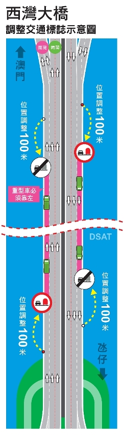 为回应业界诉求,交通事务局经评估西湾大桥的行车安全条件,于本月26日起调整西湾大桥的相关交通标志,以让重型车更安全地转线,预计最迟于本月28日完工。透过适当前后调整“禁止重型汽车超车标志”和“禁止重型汽车超车终止标志”的位置,令每行车方向各增加200米转线距离,合共400米