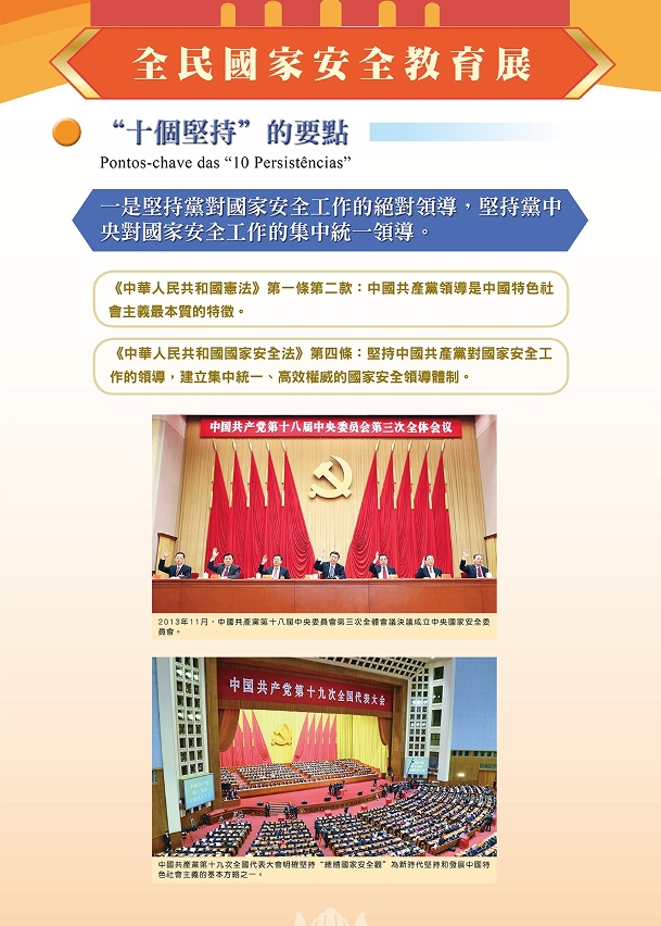 展览在“坚持总体国家安全观 构建大安全格局”章节中,介绍了总体国家安全观的内函要求系统概括的“十个坚持”,并阐述了为做好新时代国家安全工作提供行动指南和根本遵循的重要意义。