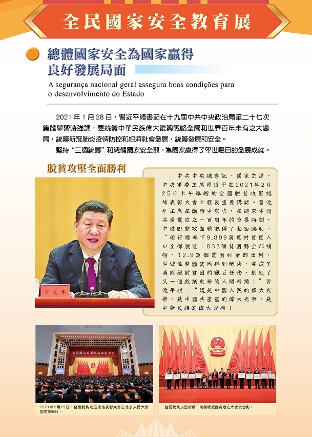 此章节也引述了习近平主席于2021年1月讲话的内容。他强调,要统筹中华民族伟大复兴战略全局和世界百年未有之大变局,统筹新冠肺炎疫情防控和经济社会发展,统筹发展和安全。坚持“三个统筹”和总体国家安全观,为国家赢得了包括脱贫攻坚全面胜利、对外开放不断提升、科学研究成果丰硕、国防能力大幅提升,以及爱国主义深入人心等举世瞩目的发展成就。