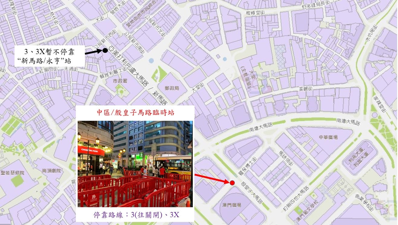 5月1日(周六)上午9时至5日(周三)晚上8时,介乎殷皇子大马路与苏亚利斯博士大马路之间一段罗保博士街临时改为无出口道路,以设置乘客排队设施。另外,南湾大马路近商业银行之的士上落客区会视乎实际人流情况暂停使用。