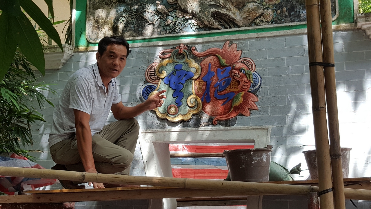 灰塑是岭南地区传统建筑装饰技艺,在澳门大部分中式文物建筑中都能找到灰塑的踪影,例如莲溪庙屋脊神兽、卢家大屋门窗装饰、郑家大屋照壁等,形象精美、构图丰富、立体感强,与广佛地区的工匠技艺一脉相承。邵成村是国家级非物质文化遗产灰塑的传承人,曾投身多项全国重点文物保护单位的灰塑修复,并多次获得联合国教科文组织及国家级的奬项,也曾莅澳指导卢廉若公园和卢家大屋的灰塑修复。