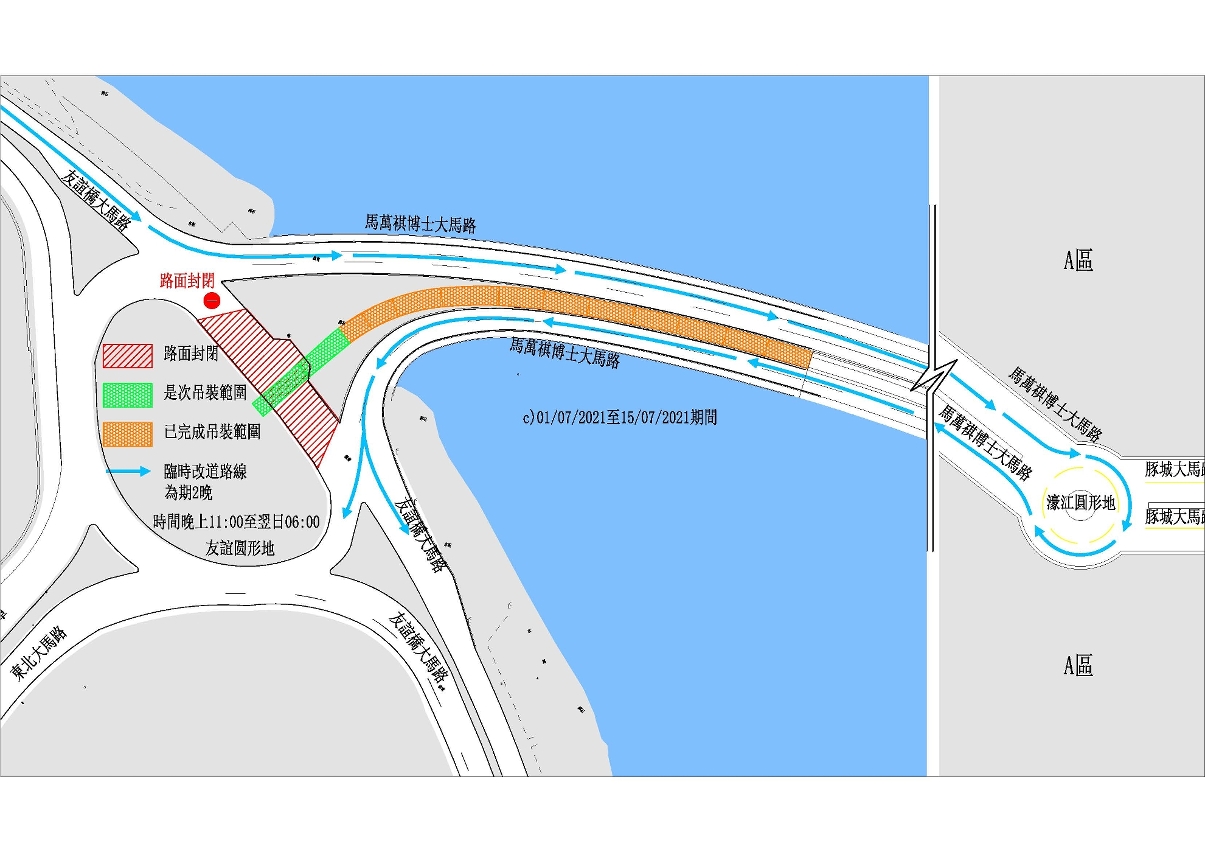 - 24/06/2021至31/06/2021期间,其中3晚将封闭马万祺博士大马路往黑沙环方向的行车道,而马万祺博士大马路往A区方向则改为临时双向行车(见图二);