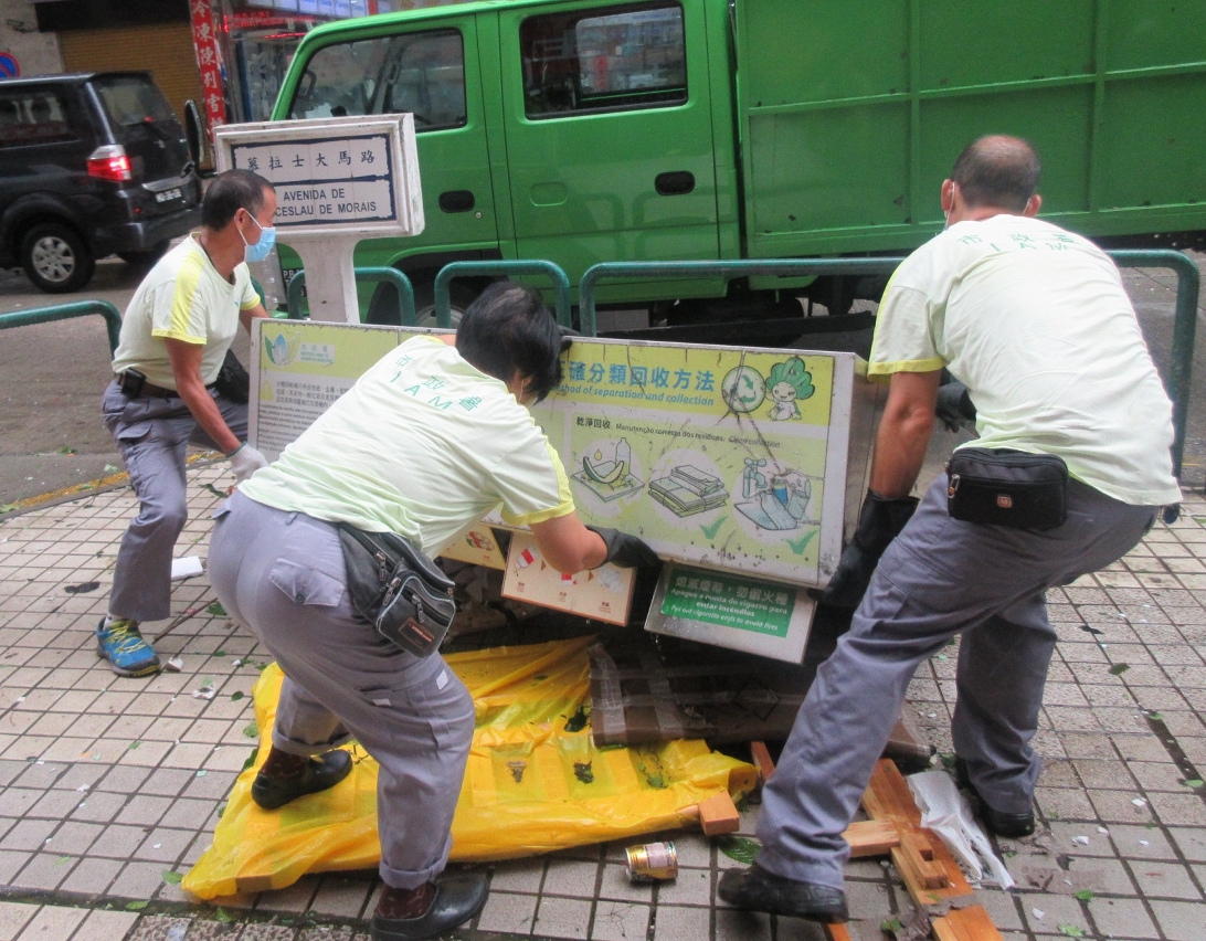 在即将悬挂八号风球前,市政署会协调清洁专营有限公司加快清理市面垃圾,并视乎情况事先加固部分垃圾收集设施,尽可能为处于低洼地区的压缩桶断电,减低垃圾收集设施因水浸而损毁的机会。同时,市政署亦会派员巡查及清理低洼地区渠口的垃圾,以免渠口堵塞,阻碍排水。在风球除下后,市政署人员会随即巡查全澳各区,协助清理车道上的障碍物及确认各区垃圾收集设施的正常运作等。若台风期间出现严重水浸,市政署将会启动应急措施,包括协调人员及设备,加快收集及清运巿面上的垃圾,以及在受影响地区设置五十五个临时垃圾收集点,方便居民弃置生活垃圾。而根据《市政署防灾减灾应变机制》,当风灾达到一定程度时,市政署将组成约三百人的救灾支援梯队,在八号风球除下后到低洼地区支援救灾善后工作。