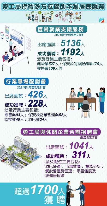 劳工局恒常就业支援服务持续积极进行,本年1月至5月21日,经劳工局转介并有出席面试累计有5,136人,当中1,192人成功获聘,涉及行业主要包括建筑业527人、保安及清洁服务业179人、零售业109人,约占70%。