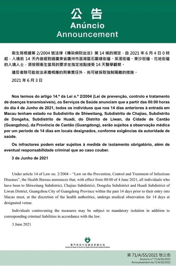 新型冠状病毒感染应变协调中心宣布,因应广东省广州市的疫情变化,卫生局根据第2/2004 号法律《传染病防治法》第14 条的规定,自 2021年6月4日零时起,所有在入境前14天内曾经到过广东省广州市荔湾区石围塘街道、茶滘街道、东沙街道、花地街道的入境人士,须按照卫生当局的要求在指定地点接受14 天医学观察,违反者除可能依法承担相应的刑事责任外,尚可被采取强制隔离的措施。