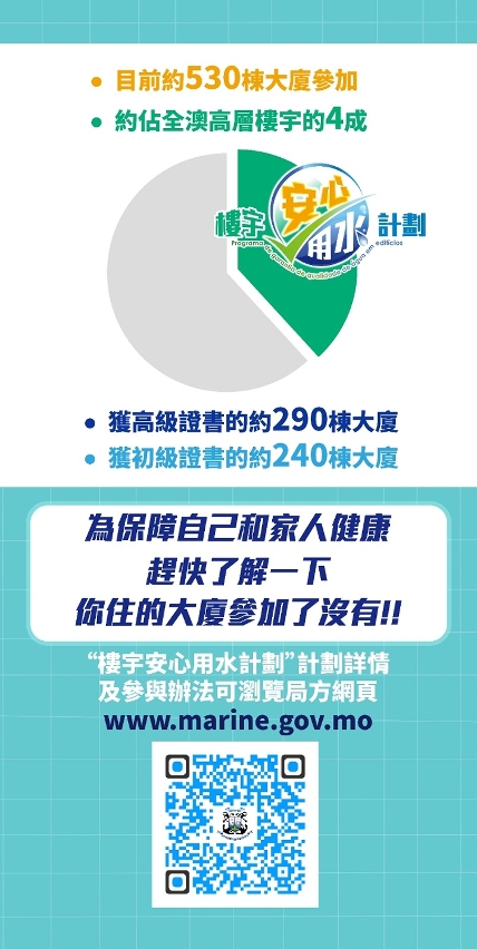 “楼宇安心用水计划”旨在促进大厦业主及物业管理实体加强楼宇自来水系统的维护管理,目前共530栋大厦参加,约占全澳高层楼宇的四成,其中获高级证书的有290多栋大厦,获初级证书的有240多栋大厦。参与计划的楼宇只要按要求对内部自来水系统进行维护,包括每半年清洗水箱一次等,即可获发初级证书;如在此基础上进行水质检验且合格,更可获发高级证书。计划详情及参与办法可浏览局方网页www.marine.gov.mo。