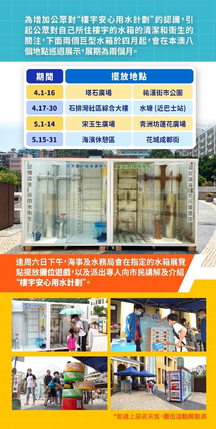 海事及水务局的“实景邋遢水箱社区巡展”正于氹仔客运码头及嘉模墟展出,以推广“楼宇安心用水计划”;另外,局方将于接连两个周末的下午二时半至五时半在氹仔嘉模墟摆放游戏及讲解摊位,欢迎市民到场参与及了解计划详情。