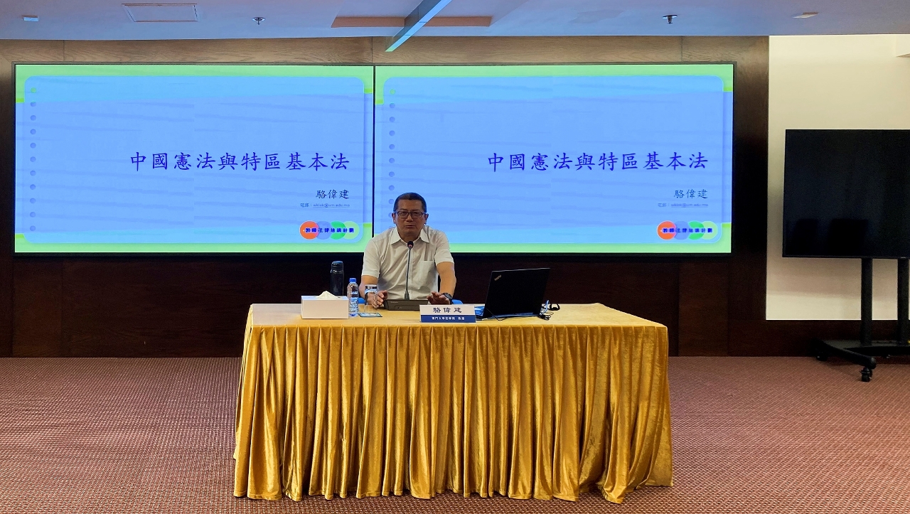 在培训讲座中,骆教授结合法律及社会实况,以生动的方式,向教师们讲解作为澳门特区宪制基础的《宪法》与《澳门基本法》的关联性,以及中央与澳门特区之间的关系等。同时介绍了《维护国家安全法》的重要性及其立法意义,以及国旗、国徽、国歌的历史由来、精神内涵和相关法律规定。此外,法务局亦安排法律人员讲解了澳门特区的刑事法律制度、常见青少年犯罪行为及相关刑责等内容。
