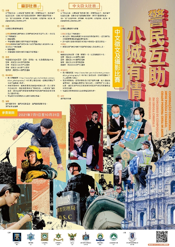 为更好地推动警队文化建设的工作,把警民合力的理念深入社区,以创建警民良好关系,提升警务效能。澳门保安部队及保安部门今年举办的中文征文比赛及摄影比赛以“警民互助,小城有情”为题,旨在凝聚维护有序社会的力量,传递警民同心互助,共同创建和谐安定的澳门。两项比赛的征集期均于2021年7月1日至10月31日期间接受报名,欢迎踊跃参与。