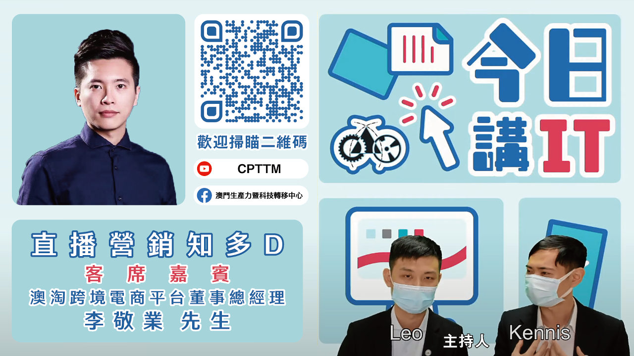 今集邀请到澳淘跨境电商平台董事总经理李敬业先生作客席嘉宾,他开设的跨境电商平台已与澳门和内地多个网红合作,并取得多个内地知名直播基地提供技术及销售渠道支援,面向澳门中小企提供服务;李先生将于节目分享如何利用直播模式推广产品及服务,以拓展其业务,内容包括介绍直播形式、平台使用、期间的准备工作及技巧,以及行业发展分享等。有兴趣人士欢迎届时登入CPTTM的Facebook专页(cpttm@facebook)或YouTube频道(https://youtube.com/playlist?list=PLf00UgvFSePfcjKWMb1xbdOBli18tfky_) 观看直播,如有任何信息科技方面的问题,欢迎在直播期间于频道实时留言互动,或电邮至ispt@cpttm.org.mo。