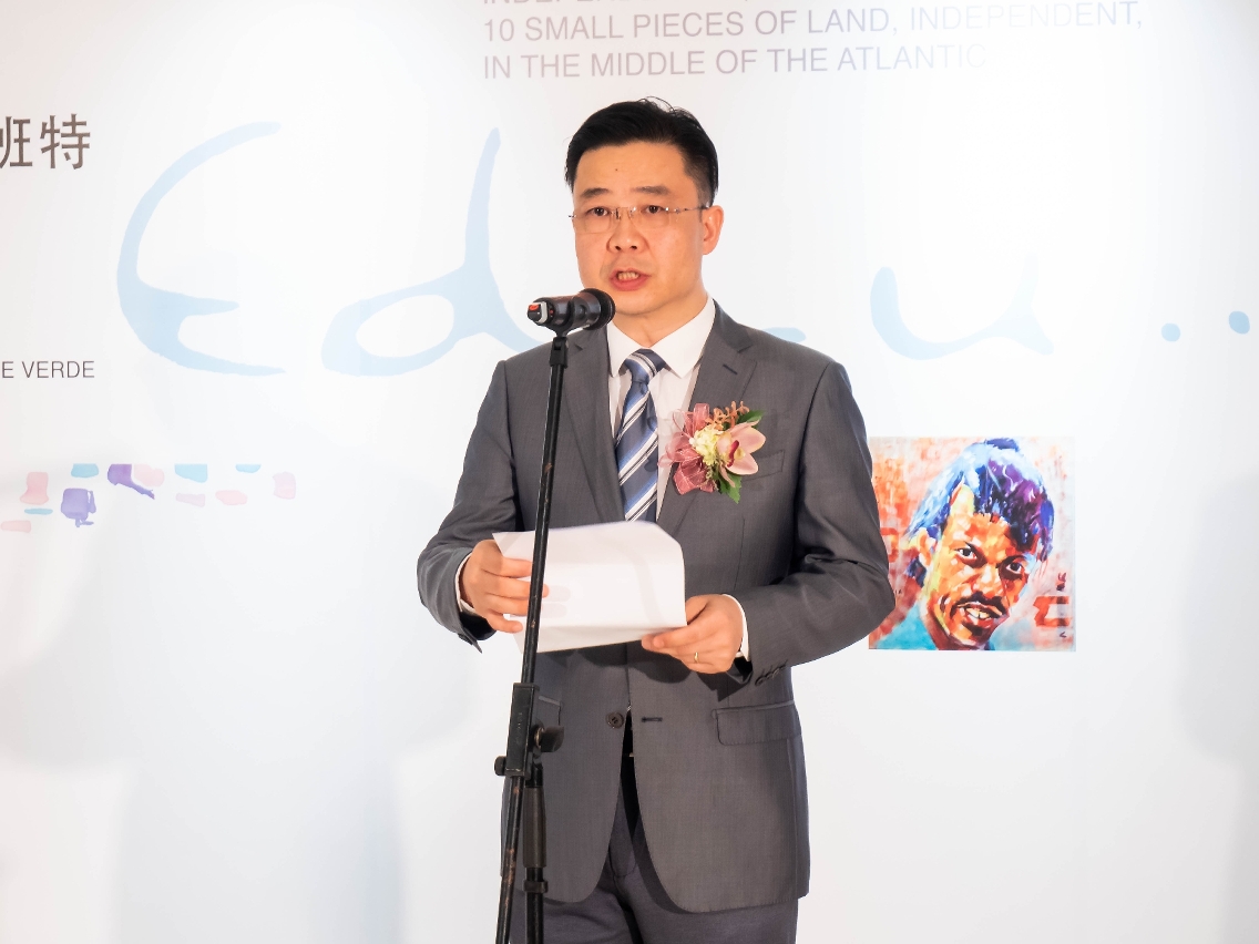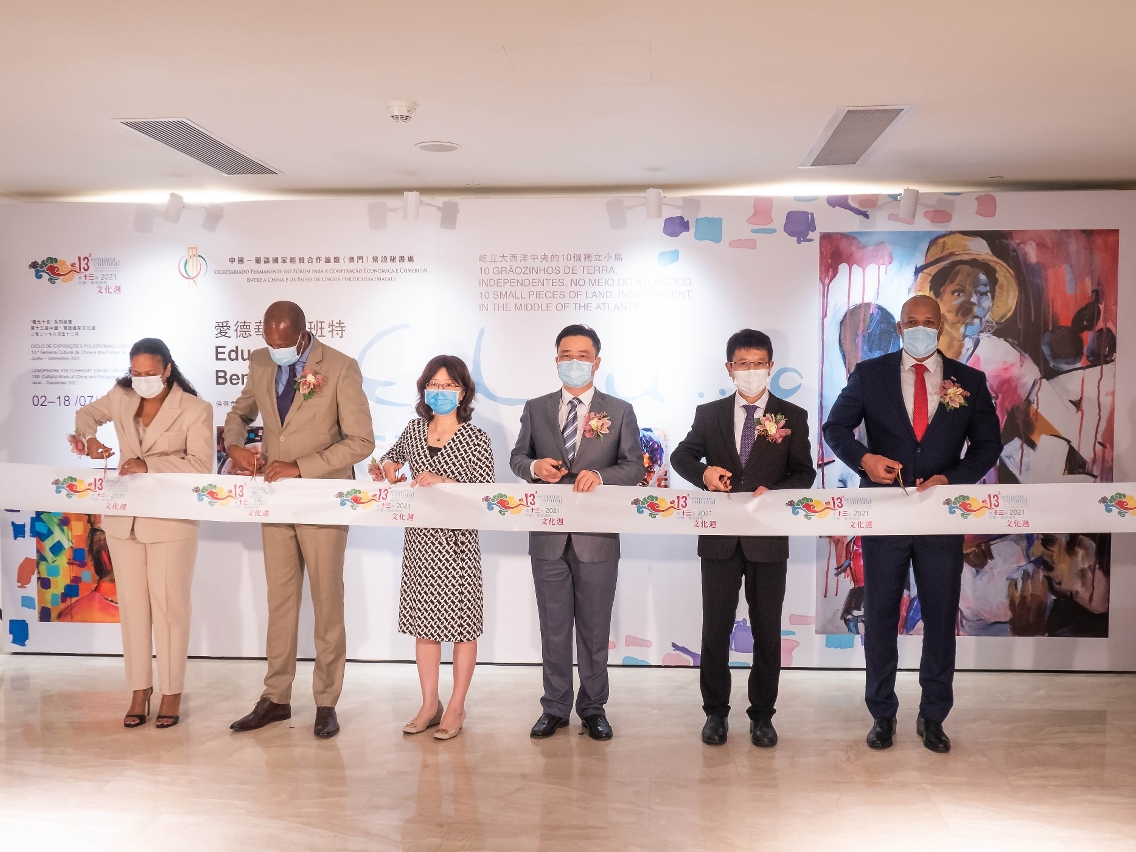 由中葡论坛(澳门)常设秘书处主办的“第十三届中国—葡语国家文化周 — 葡光十色”系列展览之佛得角艺术家爱德华多‧班特“屹立大西洋中央的10个独立小岛”作品展于7月2日(星期五)下午6时30分在中国与葡语国家商贸合作服务平台综合体举行开幕式。中葡论坛常设秘书处副秘书长丁恬出席并致辞。中央驻澳门联络办公室经济部副部长兼贸易处负责人 李华英、中央驻澳门联络办公室经济部副部长左祥华、澳门佛得角友好协会主席Ada Sousa等嘉宾应邀出席主礼。中葡论坛常设秘书处副秘书长赞东、佛得角派驻代表米格尔在座。