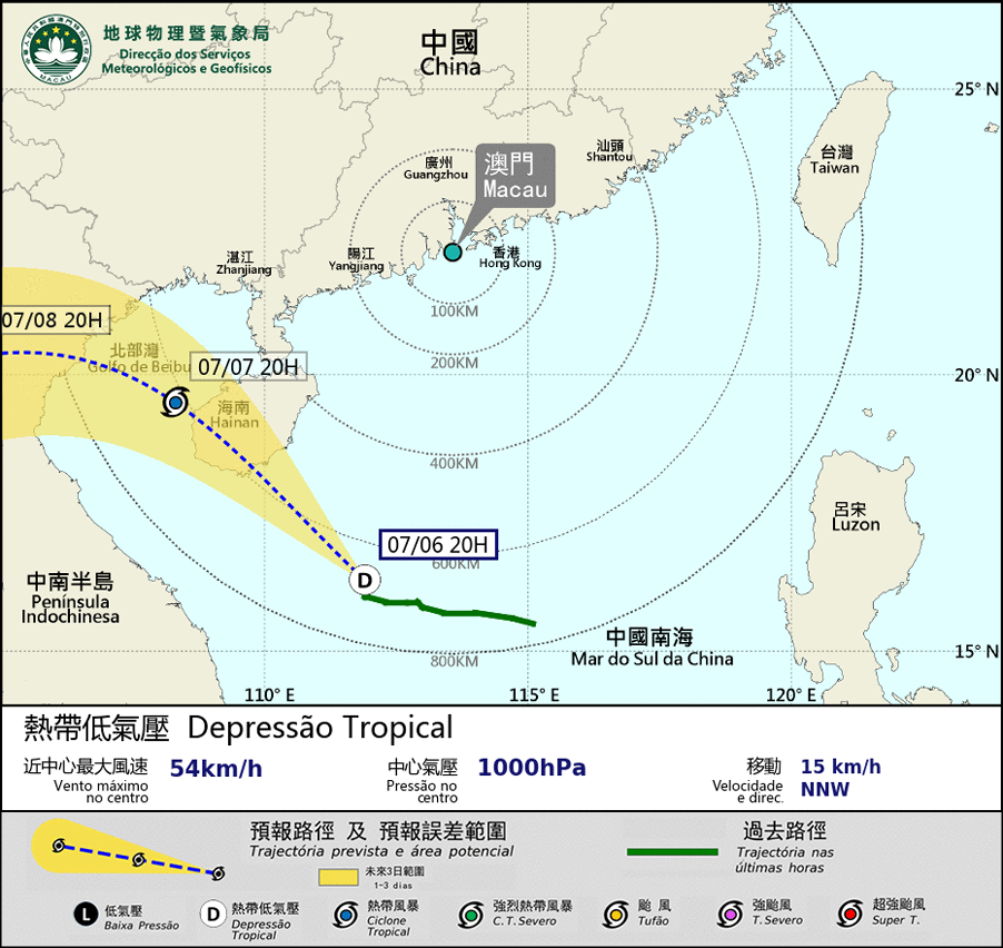 预料位于南海中部的热带低气压将向西北方向移动,大致趋向海南岛。由于该热带低气压与本澳保持一定距离,清晨前改发更高风球机会不大。同时,由于近日非天文大潮,本澳出现风暴潮水浸机会不大。