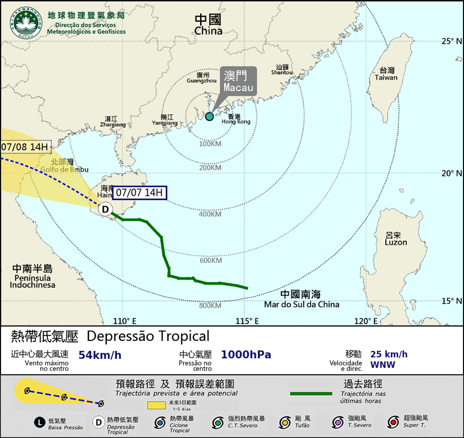 热带低气压将于中午前后登陆海南岛,且预料其登陆后会逐渐减弱及远离本澳,一号风球将维持一段时间。当热带低气压进一步远离澳门时将取消所有热带气旋信号。