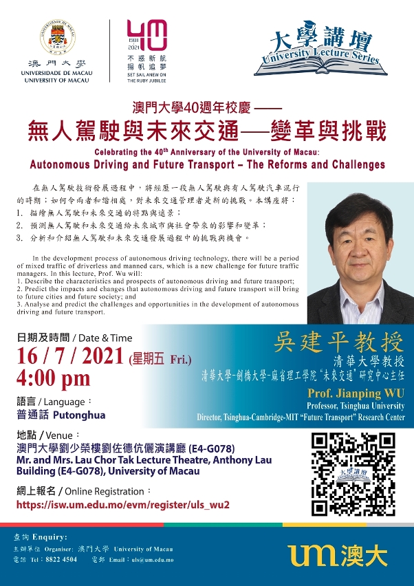 澳门大学将于7月16日(星期五)举办“澳门大学40周年校庆——大学讲坛”,由智慧城市及智慧交通专家吴建平以“无人驾驶与未来交通——变革与挑战”为题发表演说,探讨无人驾驶与智慧交通的前沿发展。