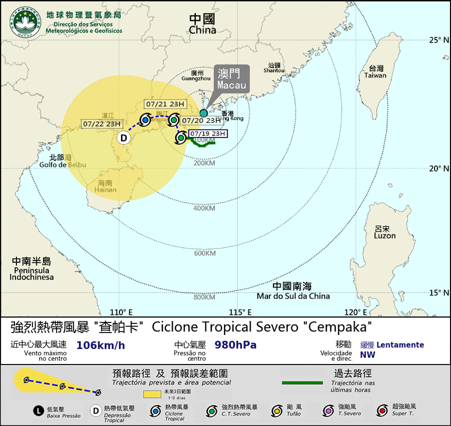 强烈热带风暴「查帕卡」在过去数小时持续增强,但转向较偏西方向移动。由于其环流较小且移动缓慢,除非其明显加强或加快接近本澳,否则清晨前改发8号风球机会不大。然而,由于预测「查帕卡」会进一步加强, 并于明日日间最接近本澳, 预计明日清晨至早上改发八号风球的机会仍属 "中等至偏高",本局会继续密切监察其发展。