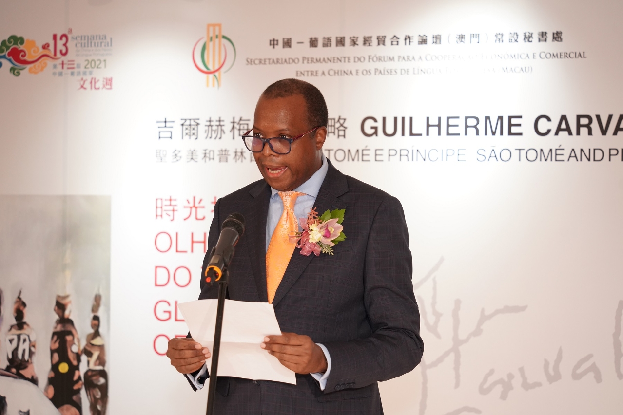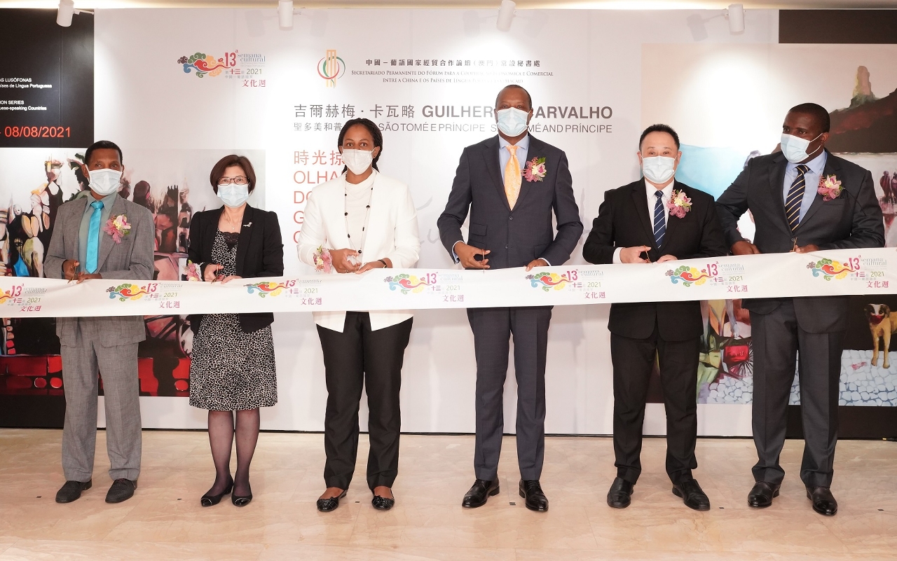 由中葡论坛(澳门)常设秘书处主办的“第十三届中国—葡语国家文化周 — 葡光十色”系列展览之圣多美和普林西比艺术家吉尔赫梅.卡瓦略“时光掠影”作品展于7月23日(星期五)下午6时30分在中国与葡语国家商贸合作服务平台综合体举行开幕式。