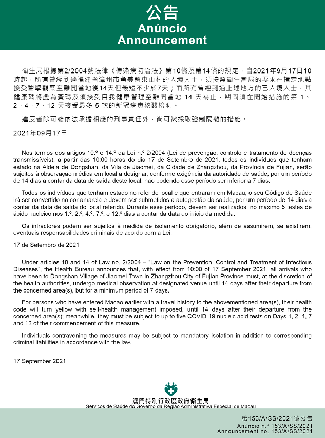 新型冠状病毒感染应变协调中心宣布,因应福建省的疫情变化,卫生局根据第2/2004号法律《传染病防治法》第10条和第14条的规定,自2021年9月17日早上10时起,所有曾经到过福建省漳州市角美镇东山村的入境人士,须按照卫生当局的要求在指定地点接受医学观察至离开当地后14天但最短不少于7天;而所有曾经到过上述地方的已入境人士,其健康码将变为黄码及须接受自我健康管理至离开当地 14 天为止,期间须在开始措施的第 1、2、4、7、12 天接受最多 5 次的新冠病毒核酸检测。免费核酸检测预约连结为https://app.ssm.gov.mo/mandatoryrnatestbook。核酸检测结果不会上载至澳门健康码亦不可作为出入境用途。如需将核酸检测结果在澳门健康码显示,则须自费检测。