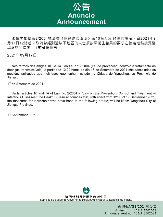 新型冠状病毒感染应变协调中心宣布,因应江苏省的疫情变化,卫生局根据第2/2004号法律《传染病防治法》第10条和第14条的规定,自2021年9月17日早上12时起,取消曾经到过江苏省扬州市的人士须按照卫生当局的要求在指定地点接受医学观察或健康码变为黄码及须接受自我健康管理的措施。