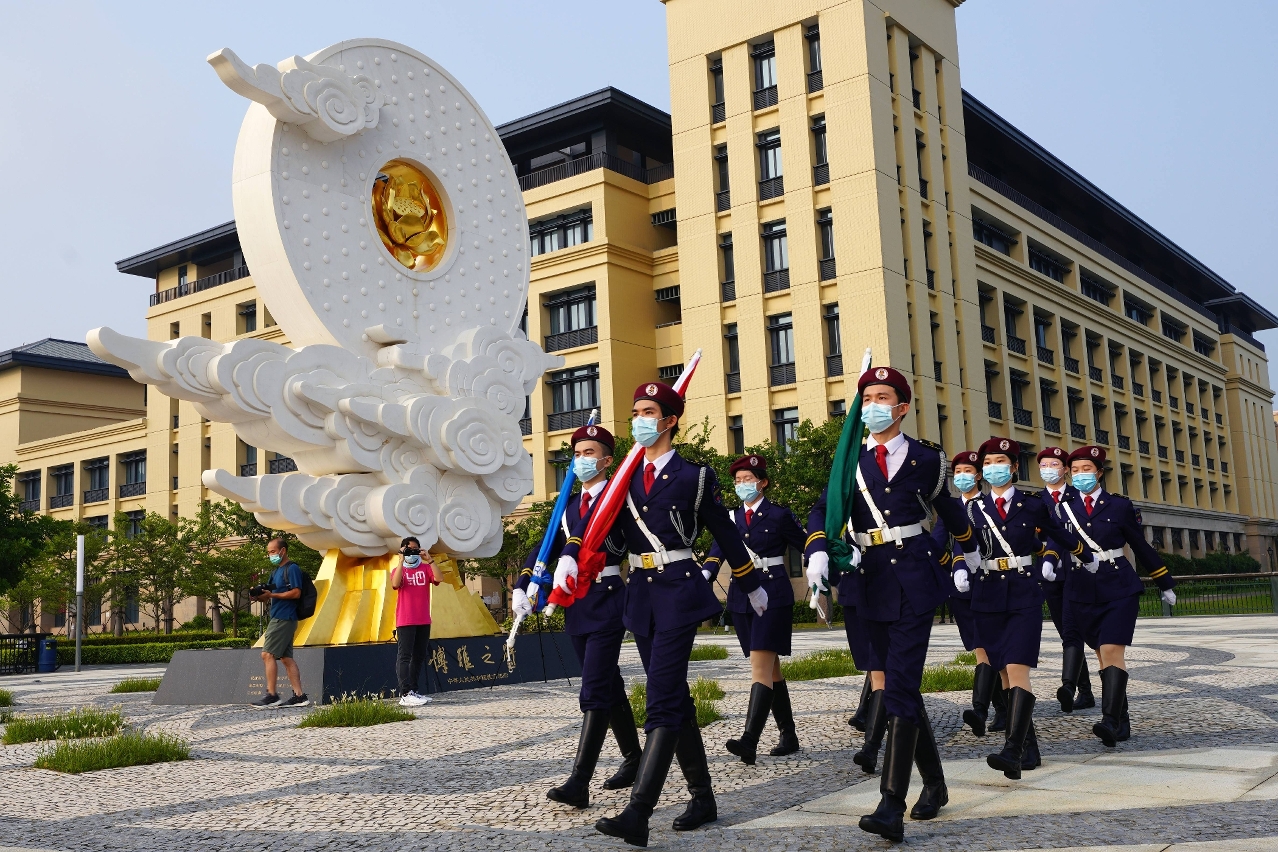 为庆祝中华人民共和国成立72周年,澳门大学国旗仪仗队今(1)日在该校莲花广场举行升旗仪式,向国家送上祝福,场面隆重。