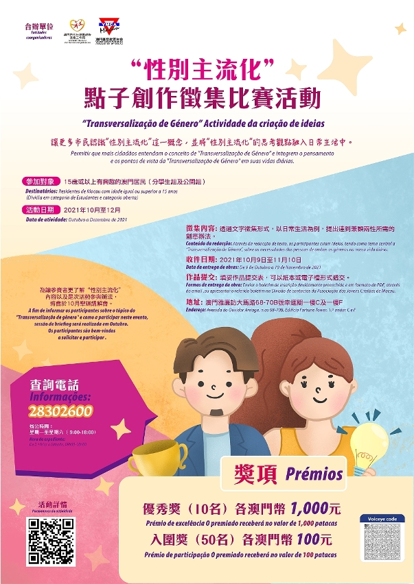 是项比赛分为学生组及公开组,两个组别均设有五个优秀奬及二十五个入围奖,优秀奖金额为1,000澳门元,入围奖金额为100澳门元。参赛者对生活中有关两性差异及不同之处,提出改善建议及创意构想,达致两性尊重和互动的目标。有关作品收件日期从2021年10月9日至11月10日止。另外,为让参赛者全面了解“性别主流化”概念,以及更好思考点子创作的相关内容,澳门基督教青年会将于10月期间举办讲解会,将致电通知参赛者有关安排。