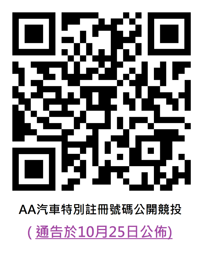 AA汽车注册号码已投入使用,而AA特别号码将于10月25日上午9时至29日下午6时接受投标,并于11月1日上午9时30分进行开标,详情可留意10月25日在交通事务局官网(http://www.dsat.gov.mo/dsat/notice.aspx)发布的通告。