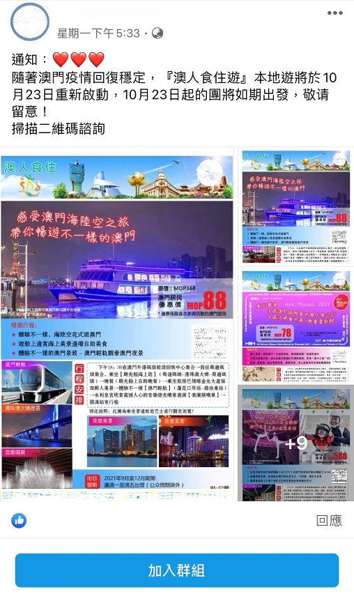 在公布“澳人食住游”本地游行程于10月23日复团后,本地旅行社纷纷透过微信及脸书等不同网络平台积极宣传本地游,希望吸引更多市民把握机会参加。