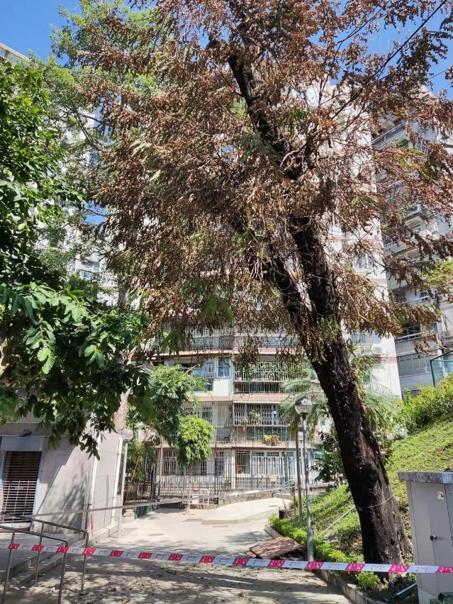 树木养护人员于二零一九年七月恒常巡查时,发现该株铁刀木感染褐根病及受台湾乳白蚁蛀食,树干基部局部腐烂及小范围蛀空,随即进行药物治疗、灭蚁及扩阔树头位置空间等护理措施,其后树木长势好转,但药物未能有效杀灭已侵入木材的褐根病菌,导致树干基部腐烂范围略有增加,故于二零二零年九月降低树木株高及用拉缆加固以降低倒塌风险。惟早前巡查发现,该树叶片开始枯黄,一周后翻查,已有超过九成叶片枯萎,情况急速恶化,树木养护人员已即时采取输液等救护措施,而为保障公众安全已将树木暂时围封,并将密切监察其状况。