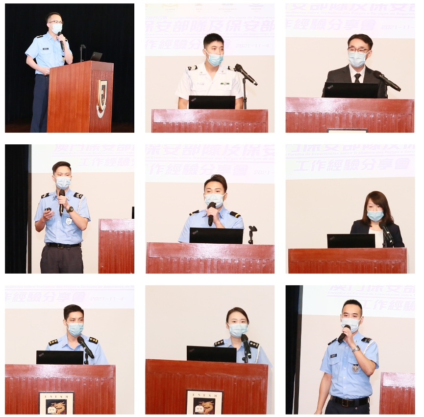 澳门保安部队及保安部门工作经验分享会已举办至第六年,来自保安范畴的九位人员按其工作实务经验和感受发言,讲者和题目依次为:警察总局张健欣副警务总长的“联防联控—疫境的闸门”;澳门海关林长龙首席关员的“难忘的工作经验”;司法警察局林振辉职务主管的“心繋社区 并肩同行─警民共护社区安宁”;治安警察局黄嘉豪警员的“无畏牺牲,执法为民”;消防局余汝华副消防区长的“我在‘高空’的日子”;惩教管理局李康婷技术员的“辅导工作中的蜕变与成长”;澳门保安部队事务局何国顺副一等消防区长的“陆路口岸之工作分享”;澳门保安部队高等学校邝子欣副警司的“全民核酸检测计划之我思‧我见”,以及治安警察局黎国新警员的“你真厉害!”。各位分享者表达了对本职工作的热爱与追求,并寄语保安部队及保安部门同仁为守护澳门的平安继续作出努力。