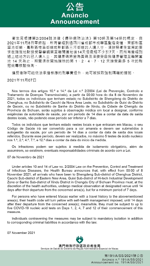 新型冠状病毒感染应变协调中心(下称“应变协调中心”)宣布,因应四川省的疫情变化,卫生局根据第2/2004号法律《传染病防治法》第10条和第14条的规定,自2021年11月8日零时起,所有曾经到过四川省成都市成华区圣灯街道、东部新区草池街道、高新区桂溪街道或新都区三河街道的入境人士,须按照卫生当局的要求在指定地点接受医学观察至离开当地后14天但最短不少于7天。而所有曾经到过上述地方的已入境人士,其健康码将变为黄码及须接受自我健康管理至离开当地 14 天为止,期间须在开始措施的第 1、2、4、7、12 天接受最多 5 次的新冠病毒核酸检测。免费核酸检测预约连结为https://app.ssm.gov.mo/mandatoryrnatestbook。核酸检测结果不会上载至澳门健康码亦不可作为出入境用途。如需将核酸检测结果在澳门健康码显示,则须自费检测。