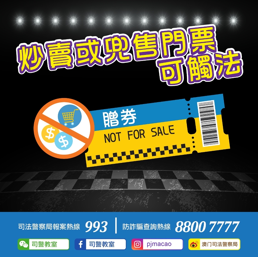 近日司法警察局发现有人于网络社交平台出售第68届澳门格兰披治大赛车的门票及赠券。司警局提醒各位市民,切勿将活动门票或赠券进行炒卖或兜售,有关行为可能会触犯法律;同时,市民应避免透过网络购买不明来历的活动门票,须警惕网购陷阱,勿让骗徒有机可乘。