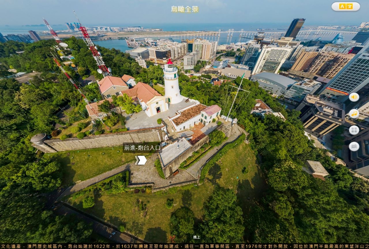 世遗VR虚拟导览提供“景区互动”及 “展品互动”两种线上导览体验,导览提供粤、普、葡、英四语导赏,公众只需滑鼠点撃或屏幕触碰,便可以自在畅游两个世遗景点,观赏东望洋炮台和郑家大屋360度环境,通过点撃建筑局部和展品位置,即可浏览建筑细节及展品高清相片,同时收听语音导览和查阅文字说明,随时随地线上畅游澳门世遗。