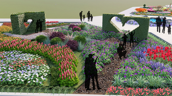 第二展区“情牵一线”:采用点线结合的动线引导游人穿过多年生花卉自然风景区,缤纷的旗帜和五彩斑斓的花朵为游人带来视觉冲击和愉悦的心情,使人乐在其中;