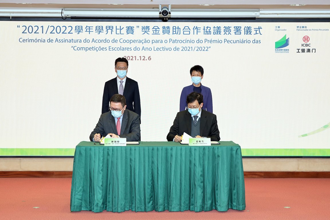 为培养学生对运动、科普、表演艺术等兴趣,同时提供互相观摩及交流的平台,教育及青年发展局每学年均举办多元化的学界比赛,领域涵盖体育、艺术、辩论、数学及科普等项目,而“2021/2022学年学界比赛”中,共有21个学界比赛项目获得中国工商银行(澳门)股份有限公司担任“奖金赞助”单位。为此,教青局于2021年12月6日举行“2021/2022学年学界比赛”奖金赞助合作协议签署仪式,在中央人民政府驻澳门特别行政区联络办公室教育与青年工作部部长徐婷、中国工商银行(澳门)股份有限公司董事长姜壹盛的见证下,教青局局长老柏生与中国工商银行(澳门)股份有限公司副行政总裁陈锦联签署奖金赞助合作协议。