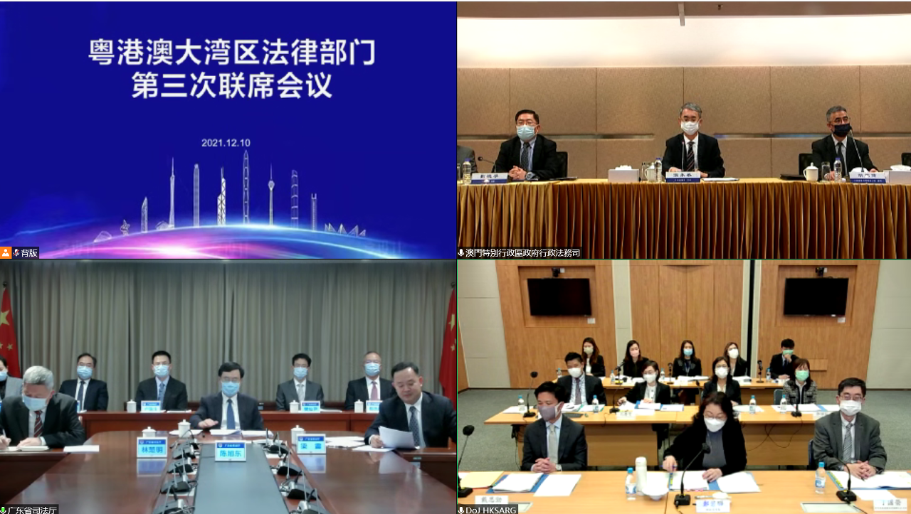 澳门特区政府行政法务司、香港特区政府律政司及广东省司法厅于今(10)日以视像方式举行粤港澳大湾区法律部门第三次联席会议,由广东省司法厅主持。会议通过了《粤港澳大湾区调解员资格资历评审标准》及《粤港澳大湾区调解员专业操守最佳准则》,并就加强大湾区的调解、仲裁合作以及共同开展法律培训等问题进行深入讨论。
